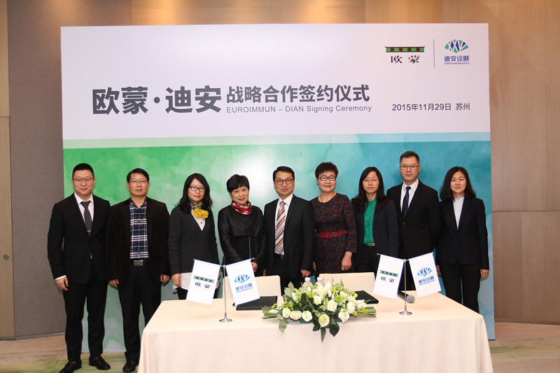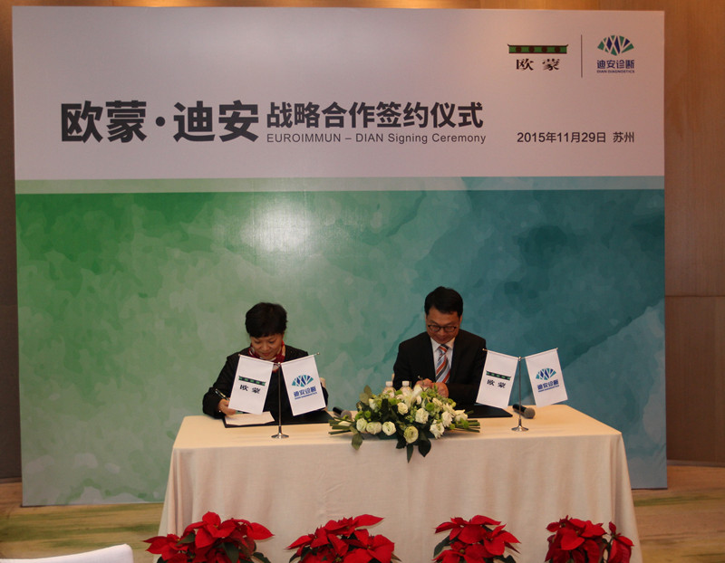 2015年11月29日,歐蒙中國集團(tuán)副總裁、歐蒙南亞及東亞集團(tuán)總裁李川先生與迪安診斷副總裁徐敏女士簽署了長期戰(zhàn)略合作協(xié)議,在未來三年中,雙方將重點(diǎn)致力于建設(shè)自身免疫性疾病、感染性疾病和變態(tài)反應(yīng)性疾病的特色診斷項(xiàng)目檢測平臺(tái)。歐蒙中國以其獨(dú)特的技術(shù)優(yōu)勢、卓越的產(chǎn)品和與國際接軌的疑難樣本驗(yàn)證服務(wù)與迪安診斷完善的醫(yī)學(xué)診斷服務(wù)網(wǎng)絡(luò)、齊全的檢測項(xiàng)目技術(shù)形成優(yōu)勢互補(bǔ),雙方將共同推廣新項(xiàng)目,通過為基層醫(yī)療工作者定制的系列培訓(xùn)來提升該類特色診斷項(xiàng)目的認(rèn)知度,有效提高該類疑難病例的診斷能力與水平,從而最終造福廣大基層患者。