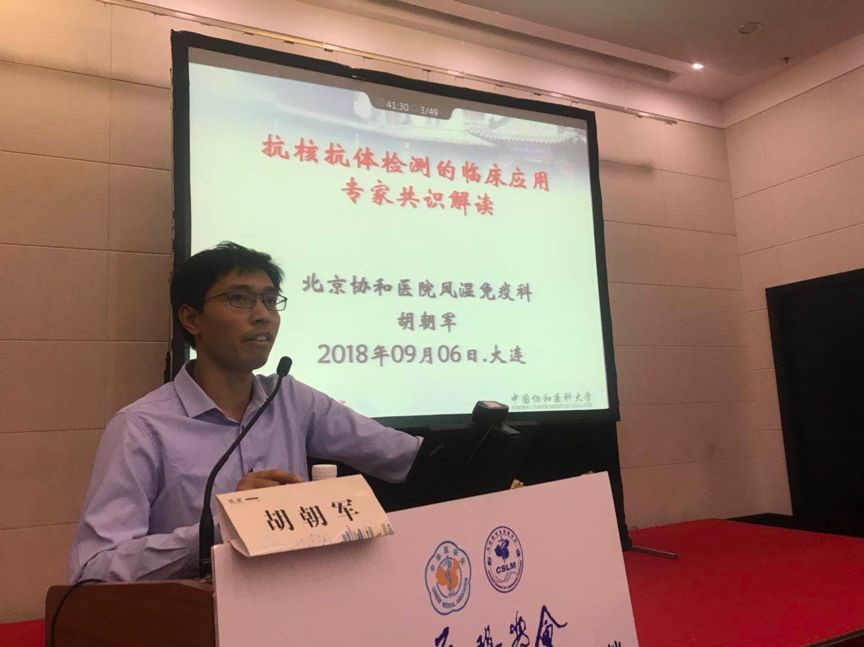 衛星會特邀上海交通大學醫學院附屬仁濟醫院檢驗科李敏主任擔任嘉賓主持,北京協和醫院風濕免疫科胡朝軍研究員為現場同仁帶來抗核抗體檢測的臨床應用專家共識解讀。現場與會者熱情滿滿,座無虛席。