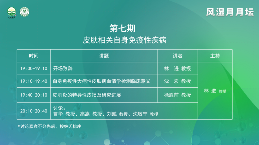 2023年2月10日,由一味書院主辦的《風(fēng)濕月月壇(第7期)——皮膚相關(guān)自身免疫性疾病》于線上成功舉行。本次論壇由浙江大學(xué)醫(yī)學(xué)院附屬第一醫(yī)院林進(jìn)教授擔(dān)任大會(huì)主席,浙江中醫(yī)藥大學(xué)附屬杭州市第三醫(yī)院沈宏教授、安徽醫(yī)科大學(xué)第一附屬醫(yī)院徐勝前教授作為講課嘉賓,上海交通大學(xué)醫(yī)學(xué)院附屬瑞金醫(yī)院曹華教授、浙江大學(xué)醫(yī)學(xué)院附屬第二醫(yī)院高嵩教授、上海交通大學(xué)附屬同仁醫(yī)院劉彧教授、南京醫(yī)科大學(xué)附屬南京醫(yī)院沈敏寧教授作為本次大會(huì)的討論嘉賓。