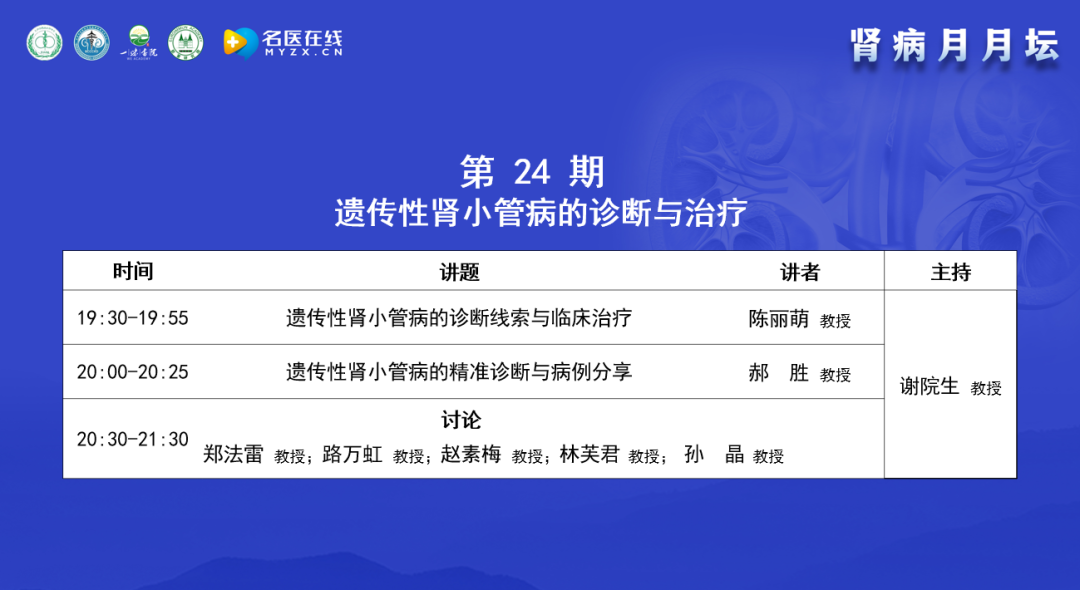 謝教授簡單介紹了“腎病月月壇”的歷史,“腎病月月壇”是在2022年5月開始舉辦的線上學術交流活動,迄今為止正好兩年時間,24個月共舉辦了24期,每月一期,每一期都是在每月第3周的周二晚上19:30-21:30開展,形式是講座與討論相結合。“腎病月月壇”最開始議題聚焦在膜性腎病,后來逐漸延展至多器官損害、新冠相關的多系統損害及風濕性疾病的腎臟損害等,今年以遺傳性腎病為主,今天的主題是遺傳性腎小管病的診斷與治療,邀請了在該領域臨床及研究方面有很深造詣的專家進行交流。