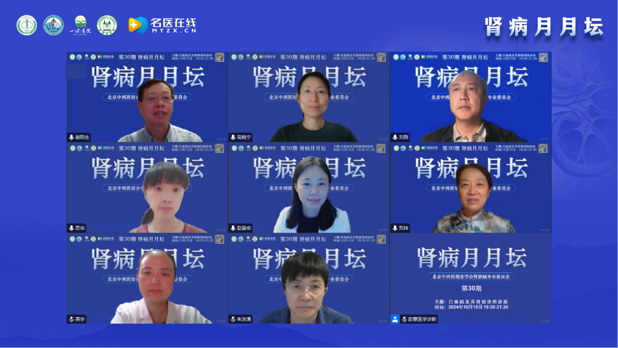 謝教授簡單介紹了“腎病月月壇”的歷史,“腎病月月壇”是在2022年5月疫情防控期間開始的線上學術交流活動,每個月第3周的周二晚上19:30-21:30開展,其形式是講座與討論相結合;每期一個主題,已完成的主題包含膜性腎病及其并發癥、風濕性疾病腎損害、遺傳性腎病、腫瘤相關性腎損害的中西醫結合診治等,至今已經是第三十期。