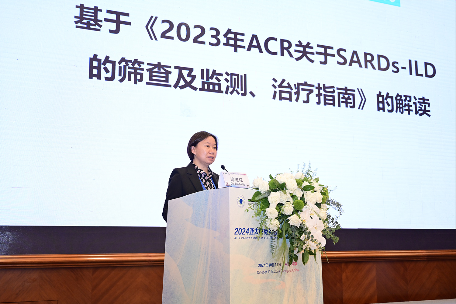 池淑紅教授做了題為“基于《2023年ACR關(guān)于SARDs-ILD的篩查及監(jiān)測(cè)、治療指南》的解讀”的精彩報(bào)告。池教授結(jié)合臨床實(shí)踐,詳細(xì)解讀了美國(guó)風(fēng)濕病學(xué)會(huì)最新發(fā)表的關(guān)于風(fēng)濕性疾病相關(guān)間質(zhì)性肺病篩查、監(jiān)測(cè)和治療的指南。報(bào)告伊始,池教授首先指出CTD相關(guān)間質(zhì)性肺病近些年受到多學(xué)科專家的關(guān)注,包括風(fēng)濕免疫科的專家,在診斷和治療等方面都取得了很大的進(jìn)步,但臨床中仍面臨很多的挑戰(zhàn),如很多醫(yī)生對(duì)CTD-ILD篩查、如何合理監(jiān)測(cè)、治療方案如何合理選擇等方面認(rèn)識(shí)上存在一些問題。本次的指南非常詳盡的就篩查、監(jiān)測(cè)和治療進(jìn)行了推薦。隨后,池教授分別就篩查監(jiān)測(cè)和治療兩篇指南進(jìn)行了解讀。在篩查和監(jiān)測(cè)部分,池教授詳細(xì)介紹了指南中對(duì)于SARD-ILD篩查和監(jiān)測(cè)的方法和頻率的推薦意見,其中特別指出,在監(jiān)測(cè)時(shí)對(duì)于部分風(fēng)濕科的醫(yī)生,相比肺功能檢查會(huì)更重視HRCT的檢查,需注意肺功能穩(wěn)定且患者沒有癥狀的時(shí)候不需要對(duì)患者頻繁地進(jìn)行HRCT監(jiān)測(cè),風(fēng)濕科醫(yī)生需要重視肺功能的檢查。在治療部分,池教授詳細(xì)介紹了指南中SARD-ILD的一線治療方案、經(jīng)治療后仍發(fā)生ILD進(jìn)展的二線治療方案和SARD合并RP-ILD的治療方案,此外,也簡(jiǎn)單介紹了指南中關(guān)于藥物毒性和監(jiān)測(cè)指導(dǎo)的建議以及SARD-ILD患者護(hù)理中可考慮的其他綜合藥物干預(yù)措施。