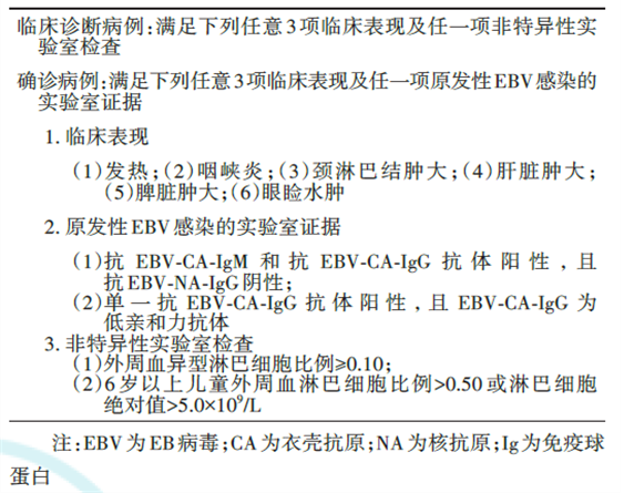 IM的診斷依據(jù)包括臨床表現(xiàn)、原發(fā)性EBV感染的實(shí)驗(yàn)室證據(jù)和非特異性實(shí)驗(yàn)室檢查(表1)。臨床診斷病例需滿(mǎn)足臨床表現(xiàn)中任意3項(xiàng)及非特異性實(shí)驗(yàn)室檢查中任意1項(xiàng),確診病例需滿(mǎn)足臨床表現(xiàn)中任意3項(xiàng)及原發(fā)性EBV感染的實(shí)驗(yàn)室證據(jù)中任意1項(xiàng)。